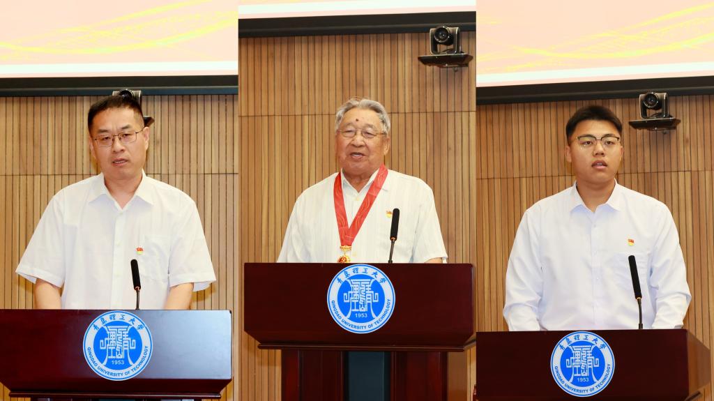 老党员代表、已有64年党龄,2021年“光荣在党50年”勋章获得者施广鹏老师在发言中,寄语全校党员要勇于创新、服务国家需求,共同为实现中华民族伟大复兴、为推动学校事业高质量发展贡献力量。“两优一先”代表、环境与市政工程学院教授张华伟在发言中,分享了科研团队攻克黄河流域生态环境保护协同创新技术难题、以红色引擎推动科研创新的行动感悟。新发展党员代表、土木工程学院2023级研究生李子龙在发言中表示,将在投身国家重大战略需求和行业前沿中践行‘强国有我’的誓言,传递“后浪奔涌”的蓬勃力量,彰显红色基因的代际传承。