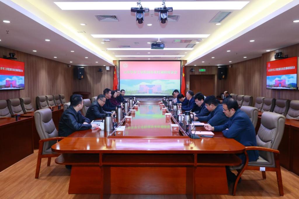 11月18日,山东华宇工学院党委书记李国华一行来校调研交流。党委书记杨赟会见李国华一行,党委常委、副校长郭建锋出席座谈会并致辞,党委常委、统战部部长陈伟,相关学院及职能部门负责人参加交流。会议由人事处(教师工作部)处长(部长)王雄主持。