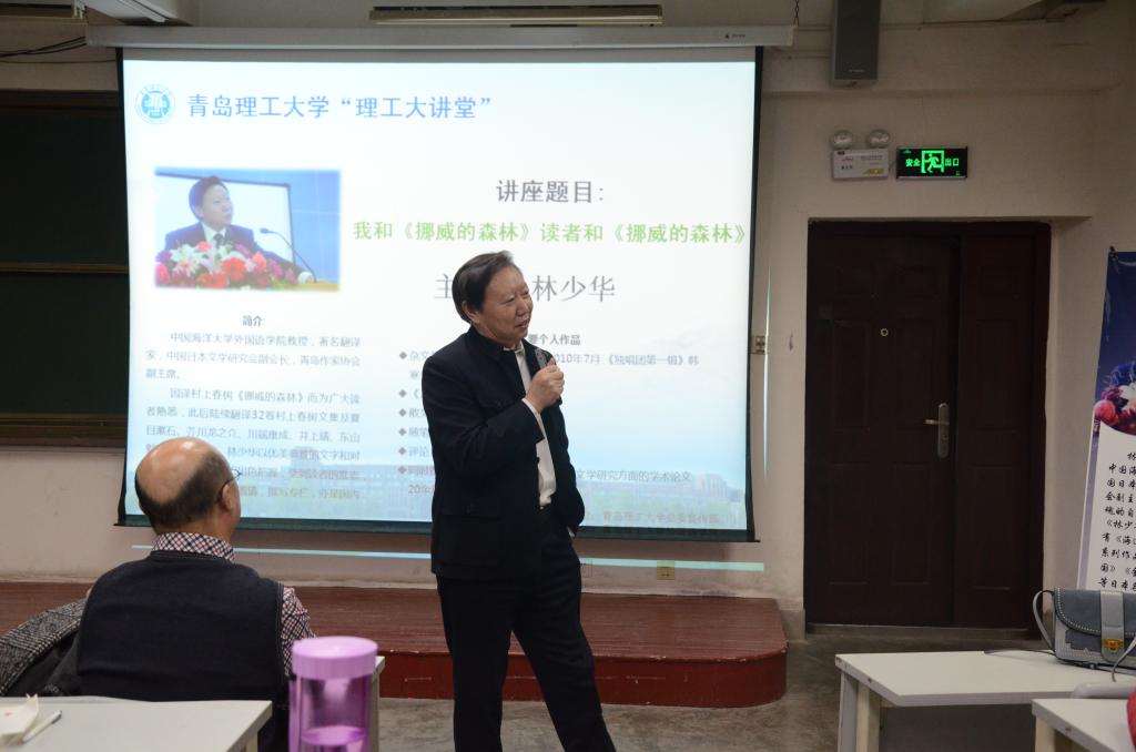 讲座中林少华教授介绍了村上春树先生的《挪威的森林》有关情况,动情地回顾了自己翻译《挪威的森林》的经历。林少华教授认为,一个优秀的译者应该有着强烈的艺术和语言自觉,应秉承超越原著的目标复现原著的味道,不应该被原文所束缚。他还如数家珍般地介绍了读者与《挪威的森林》一书的故事并表示,《挪威的森林》不仅是青春的安魂曲或墓志铭,更是青春的驿站和永远的风景线。林教授对村上文学的独到讲解,展现出其诗意的语言风格,让师生受益匪浅。