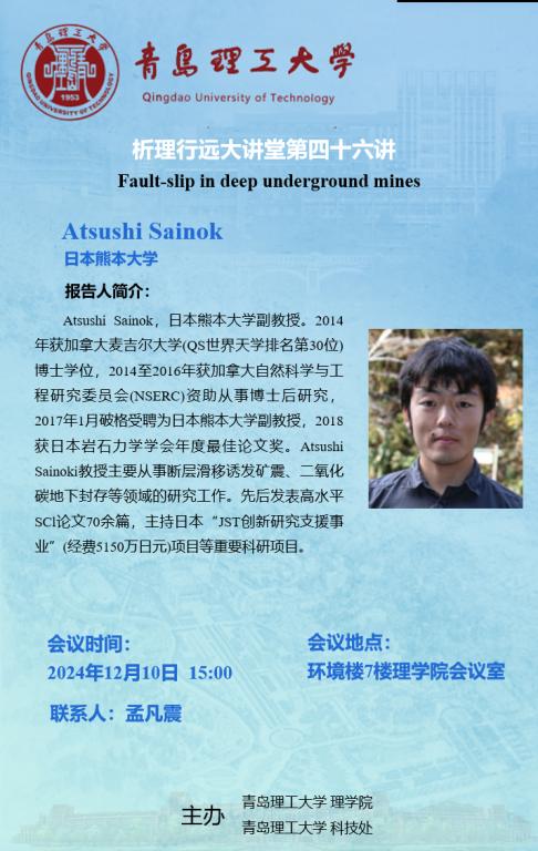 Atsushi Sainok,日本熊本大学副教授。2014年获加拿大麦吉尔大学(QS世界天学排名第30位)博士学位,2014至2016年获加拿大自然科学与工程研究委员会(NSERC)资助从事博士后研究,2017年1月破格受聘为日本熊本大学副教授,2018获日本岩石力学学会年度最佳论文奖。Atsushi Sainoki教授主要从事断层滑移诱发矿震、二氧化碳地下封存等领域的研究工作。先后发表高水平SCl论文70余篇,主持日本“JST创新研究支援事业”(经费5150万日元)项目等重要科研项目。