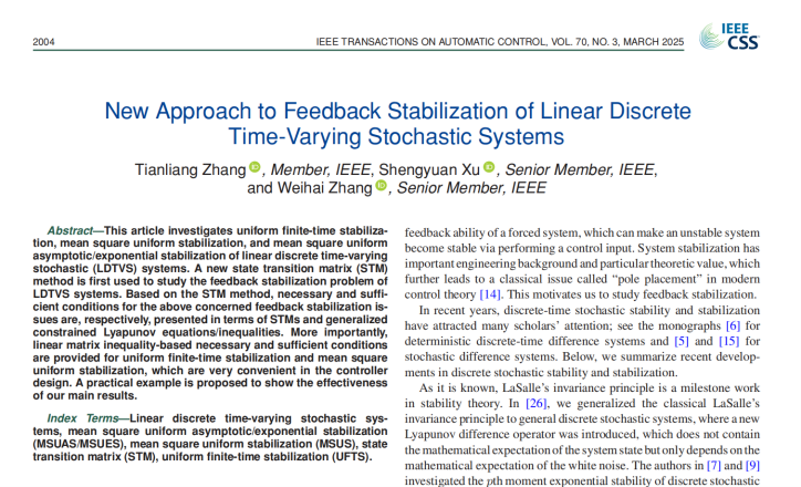 米兰信息与控制工程学院张天良副教授所在的“信息物理融合系统智能优化控制研究团队”在离散时变随机系统的反馈稳定化研究方面取得重要进展。2025年3月张天良副教授作为第一作者、ac米兰官方中文网站作为第一作者单位在控制领域顶级期刊《IEEE Transactions on Automatic Control》发表的最新论文“New Approach to Feedback Stabilization of Linear Discrete Time-Varying Stochastic Systems”中,提出了基于状态转移矩阵(STM)的新方法,解决了线性离散时变随机(LDTVS)系统的反馈镇定性问题。