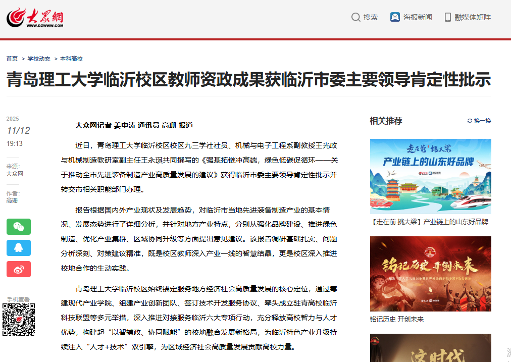 【大众网】ac米兰官方中文网站临沂校区教师资政成果获临沂市委主要领导肯定性批示