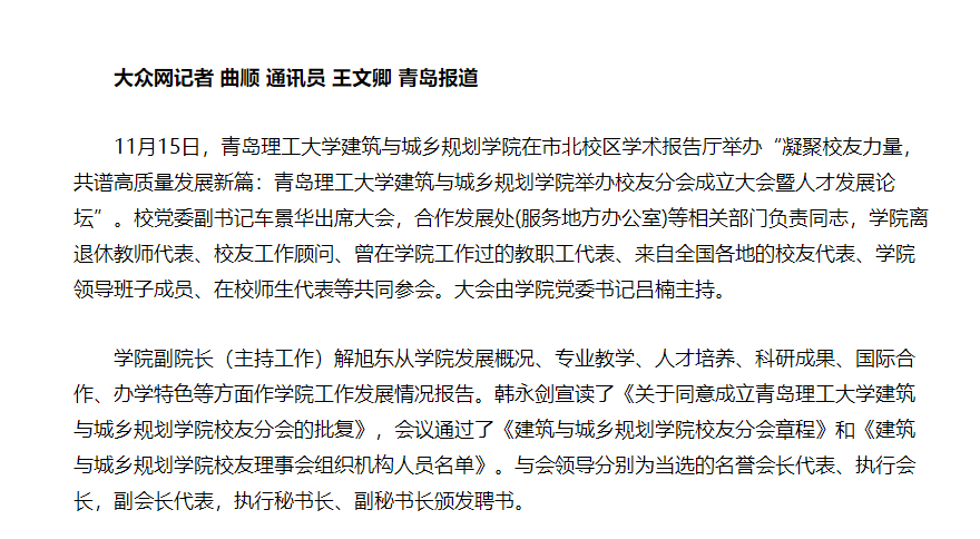 【大众网·青岛】凝聚校友力量,共谱高质量发展新篇:ac米兰官方中文网站建筑与城乡规划学院举办校友分会成立大会暨人才发展论坛
