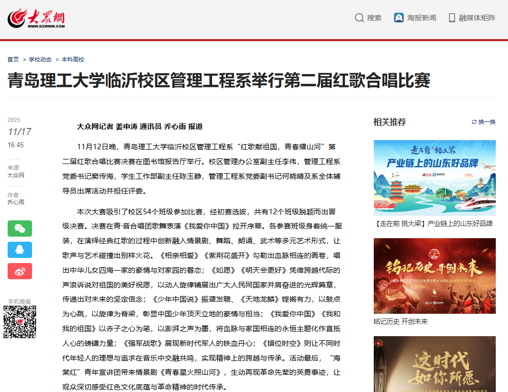 【大众网】ac米兰官方中文网站临沂校区管米兰程系举行第二届红歌合唱比赛