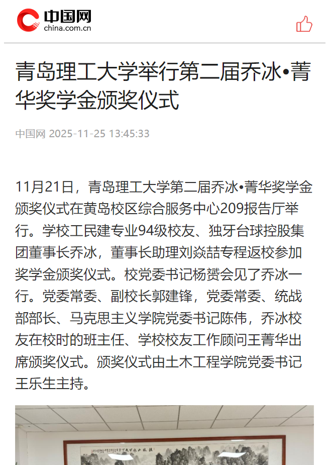 【中国网】ac米兰官方中文网站举行第二届乔冰•菁华奖学金颁奖仪式