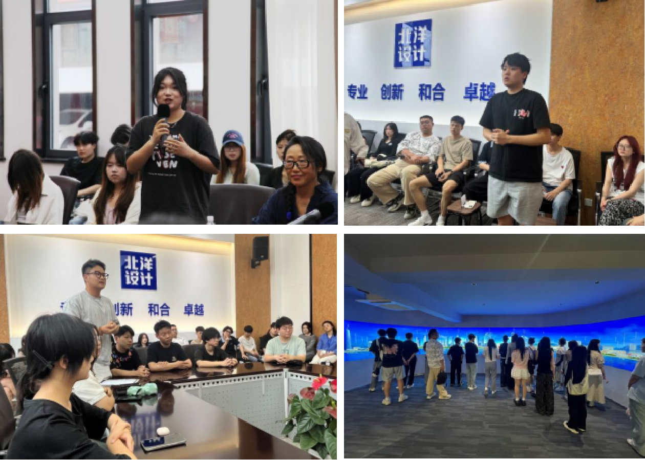 座谈结束后,师生们走进北洋企业展厅,通过荣誉墙、经典项目案例等展示内容,沉浸式感受企业发展历程与文化积淀。在建筑、规划、景观设计研究所,设计师们专注的工作场景、贴满灵感便签的创意墙、铺满建材的展示台以及实时修改的项目方案,全方位呈现设计项目从构思到落地的完整链条。学生们近距离观察专业工作环境,直观了解行业一线工作状态,进一步明晰职业发展方向,学习热情被充分激发。