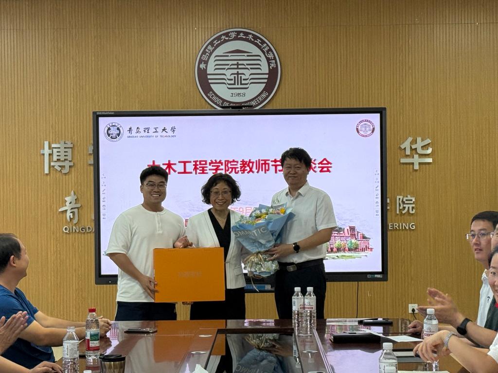 侯东帅为“从教满40年”教师时伟、“从教满30年”教师刘文锋、郭鹏、郑少瑛、范宏颁授鲜花和纪念品,向他们数十年如一日坚守教育岗位、深耕土木工程领域的敬业精神和育人情怀表达衷心感谢。侯东帅表示,学院老教师们以坚守与情怀培养人才、沉淀优良教风,为学院发展奠定坚实基础,这些宝贵的精神财富值得全体师生传承发扬。青年教师是学院发展的“生力军”,学院将全力为大家搭台赋能,进一步完善老中青教师结对“传帮带”制度,在课程打磨、科研立项等方面提供精准指导,为青年教师成长提供有力支撑。