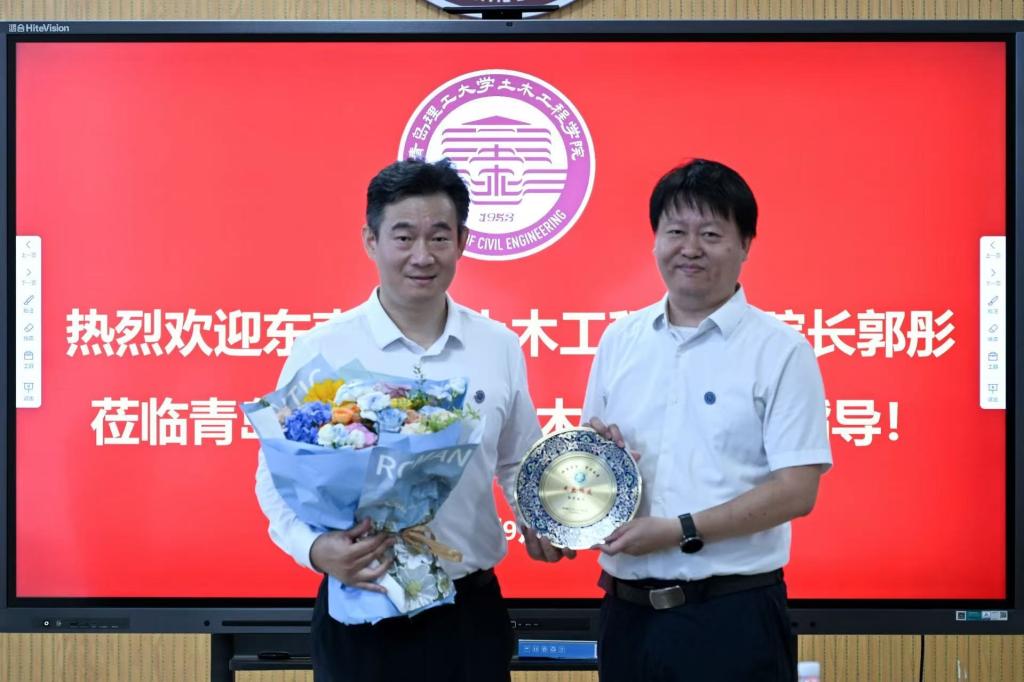 侯东帅代表学院致欢迎辞,对郭彤的到来表示热烈欢迎,对他始终心系母校、支持学校学院发展表示衷心感谢,并为郭彤颁发“杰出校友纪念品”,感谢他长期以来对母校发展的关心与支持。并简要介绍了土木工程学院近年来在学科建设、人才培养、科学研究等方面取得的进展,详细介绍了土木工程学科的发展现状、存在问题及未来规划,重点围绕学科方向凝练、平台建设、团队建设、科研成果转化等方面进行了系统汇报。