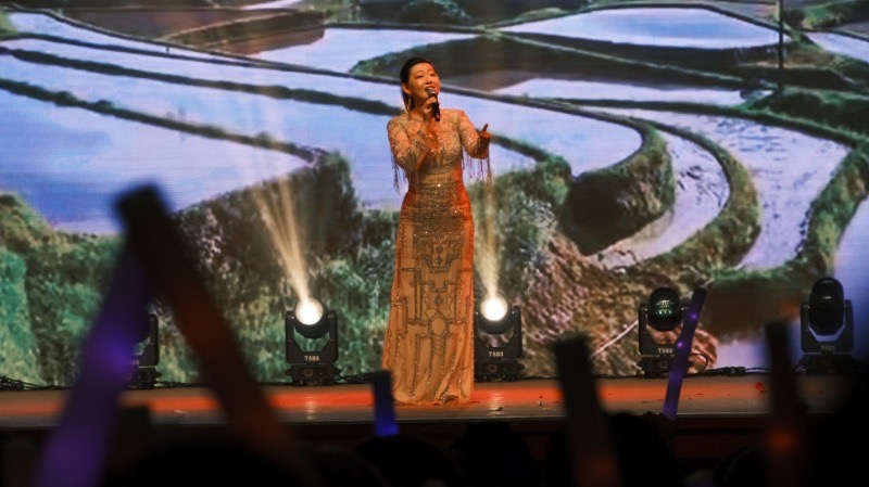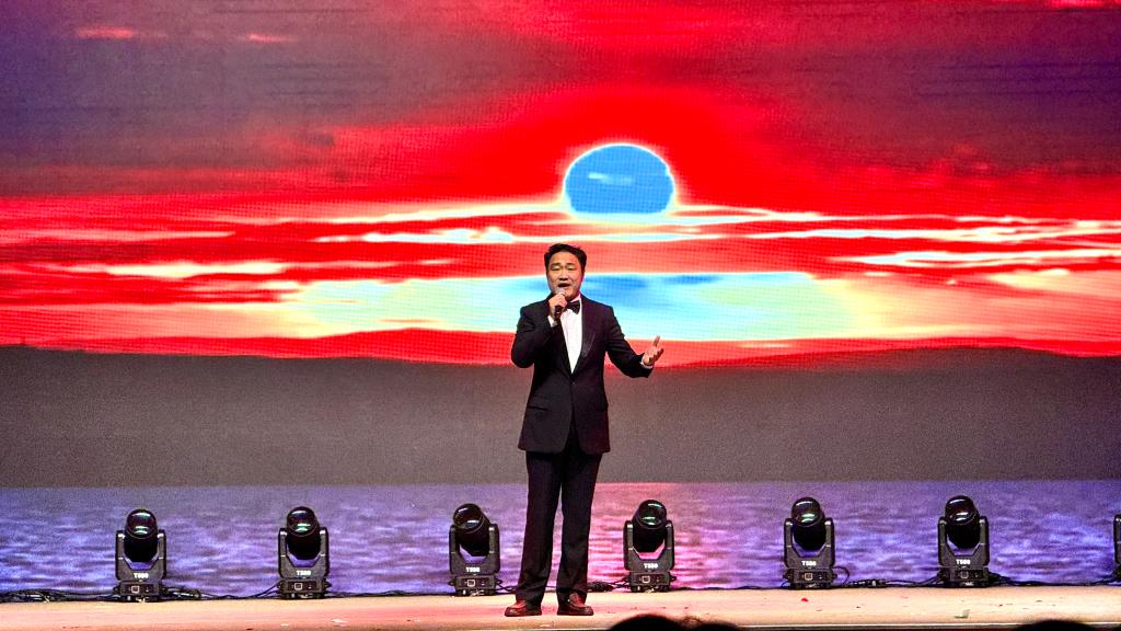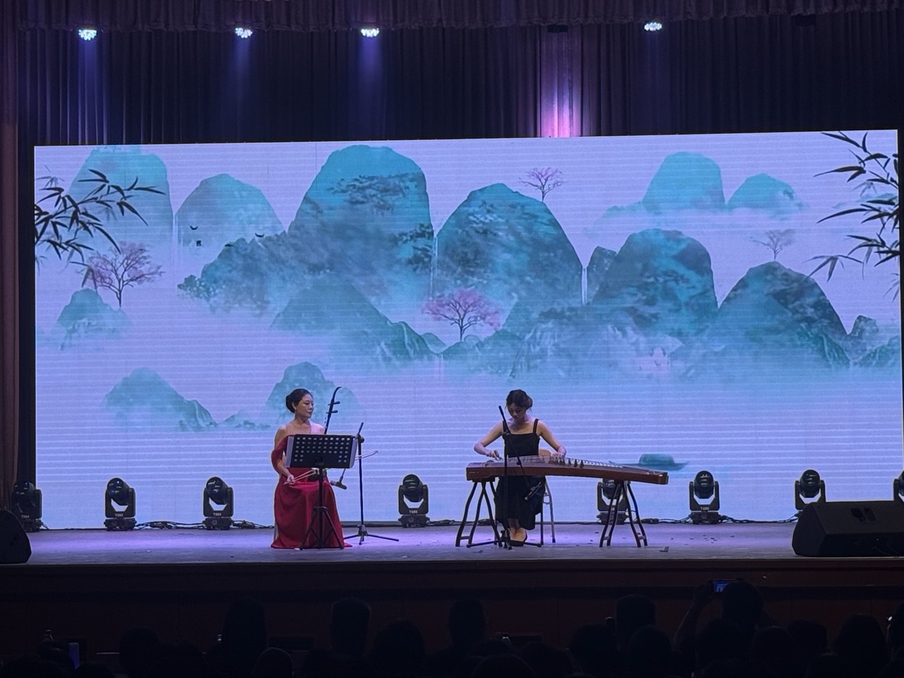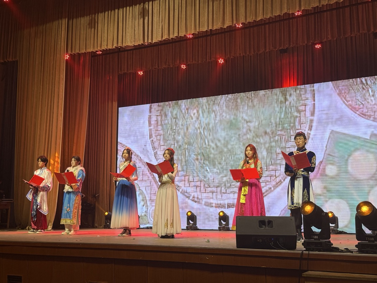 “美·共赴华章”篇章将晚会推向高潮,凸显了美育的多元与包容。少数民族同学朗诵《民族团结心 共铸中华情》勾勒出和谐共生的画卷之美。王雅鸣老师深情寄语,引领同学们以一曲《水手》,吹响了风浪中前行的号角。张蕊蕊老师优雅的民乐《渔舟唱晚》与韩凯老师经典歌剧选段《我的太阳》同台辉映,一中一西,一阳刚一婉约,完美展示了音乐作为世界语言的无穷魅力,体现了美育在融汇古今、贯通中西中的桥梁作用。