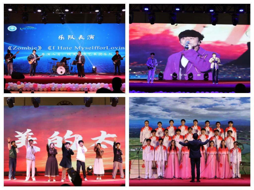 大学生艺术团的乐队表演瞬间点燃全场,《落叶归根》《当你》等歌曲以动人旋律串起青春记忆,唱出新时代青年对家国的深情与对梦想的执着,掌声如潮,晚会气氛升至高潮。舞蹈《喜雨聆风》以柔美舞姿展现机车学子刚柔并济的品格,相声《卷王之王》幽默讲述大学生活趣事,最后在合唱团《歌唱祖国》的嘹亮歌声中,华彩瞬间定格,晚会落幕。