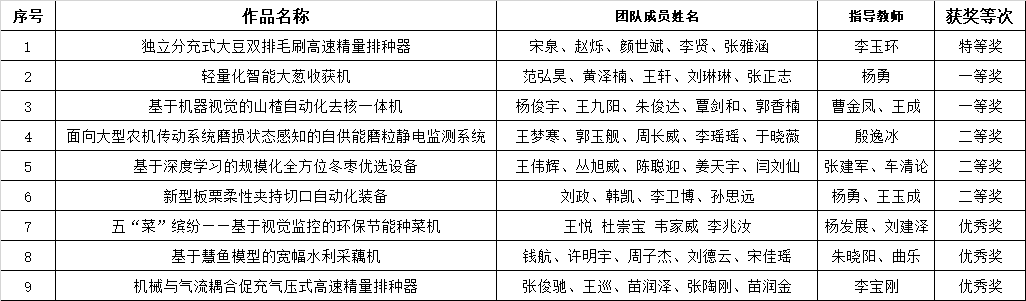本届大赛以“创新赋能农装,智能引领未来”为主题,以培育行业亟需的“专业知识雄厚、动手能力较强、创新创业能力过硬”的现代农业装备创新创业人才为目标。大赛共设置A类(自由选题类)、B类(机器人类)、C类(企业出题类)、D类(概念设计类)四个类别竞赛项目。机械与汽车工程学院共有9个项目从126所高校的1203个项目中脱颖而出,其中,李玉环老师指导的《独立分充式大豆双排毛刷高速精量排种器》荣获大赛A类特等奖,杨勇老师指导的《轻量化智能大葱收获机》,以及曹金凤老师、王成老师指导的《基于机器视觉的山楂自动化去核一体机》荣获大赛A类一等奖。