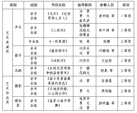 本届展演活动自5月份启动以来,学校高度重视,团委积极组织协调,信息与控制工程学院、建筑与城乡规划学院、艺术与设计学院选派优秀青年教师参与指导,精心策划编排节目,组织动员青年师生创作了一批高水准艺术作品。其中,信息与控制工程学院逐梦合唱团推送的大合唱《无衣》《这世界那么多人》荣获艺术表演类一等奖,并赴济南参加现场展演;建筑与城乡规划学院推送的小合唱《人世间》,大学生艺术团推送的器乐表演《盛世国乐》和《浏阳河》荣获艺术表演类二等奖;另有5项作品荣获艺术表演类、艺术作品类三等奖。
